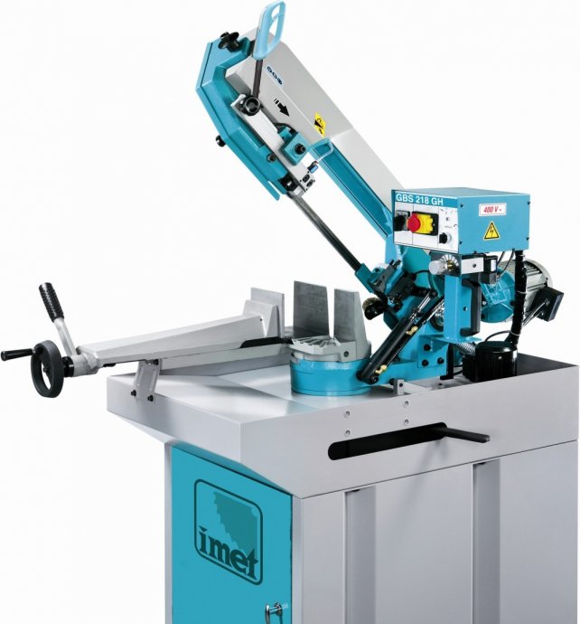 Radionička, bravarska tračna pila za rezanje metala Imet GBS 218 sa hidraulički kontroliranim automatskim reznim posmakom (fina regulacija brzine uljne kočnice potenciometrom na kontrolnom panelu stroja).