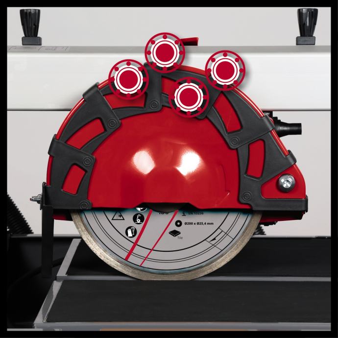 Einhell stroj za rezanje pločica TE-TC 920 UL idealan je partner za projekte oko kuće: od proširenja, prenamjene i velikih restauracija do renoviranja jednokrevetnih soba, hobi prostora ili kreativnih radionica. Rezač pločica je nezamjenjiv u svim takvim poslovima u kući: uvijek postoji nešto što treba rezati, bilo da se radi o zidnim i podnim pločicama u kupaonici ili kuhinji, prostoru oko pećnice, praonici rublja ili kotlovnici. Opremljen odgovarajućim diskom za rezanje za dotični materijal, ovaj radijalni rezač pločica će rezati zidne pločice, podne pločice, pa čak i kamenu keramiku bez napora, točno i bez ikakvih smetnji od prašine. Einhell radijalni stroj za rezanje pločica dizajniran je da se nosi s ekstra dugim rezovima koje zahtijevaju današnje velike pločice. Laser pruža optičku pomoć tijekom rezanja. Vodilica motora sa svojih šest kugličnih ležajeva osigurava visoke performanse za glatko rezanje. Točno vođenje ruba posao je za kutni graničnik koji se može precizno podesiti do stupnja i pruža potrebnu stabilnost za koso rezanje i dvostruke rezove.Pumpa za vodu dolazi s hvatačem prljavštine i perivim filtarskim zaštitama kako bi se spriječile velike krhotine i čvrste čestice. Za dodatnu zaštitu crpke tu je i integrirani filter za uklanjanje sitnih metalnih čestica. Spremnik za prikupljanje vode izrađen je od čeličnog lima. Za potporu, rezač pločica je montiran na robusno sklopivo kućište. Podnožje podesivo po visini može se podesiti na udobnu radnu visinu. Veliki radni stol s protukliznom gumenom površinom već nudi dovoljno radnog prostora za manje poslove. Za veće zadatke postoje dva dodatna radna stola za proširenje radnog područja. Robusni transportni kotači i ručka omogućuju vam da s lakoćom manevrirate područjem rezanja.