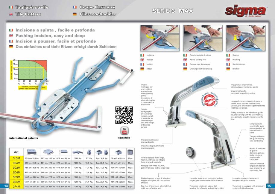 Mjerni graničnik koji se okreće za -45°i +45° sa zaključavanjem pozitivnog kuta Sigma rezači su profesionalni ručni rezači svih vrsta pločica. Zbog jednostavnog korištenja i preciznosti namjenjeni su profesionalcima i svima koji se tako osjećaju. Već duži niz godina Sigma rezači pločica su sinonim za vrhunsko rezanje pločica i kod većine keramičara broj 1 pri izboru novog alata. U ponudi su, osim ručnih rezača, stolovi za rezanje (workbench) i naprave za rezanje pod kutom (jolly edge) i rezanje velikih formata pločica (kera-lift) Pogledajte video o načinu rukovanja sa Sigma rezačem keramičkih pločica 90cm 3D4M (vrijedi i za sve ostale rezače iz serije max 3 – rezanje gurenjem) https://www.youtube.com/watch?v=uNlLC4mqc1E Sigma rezač keramičkih pločica 90cm 3D4M