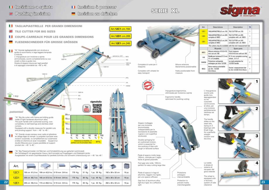 Za rezanje izrazito velikih formata, 4 bočna držača pločice Sigma rezači su profesionalni ručni rezači svih vrsta pločica. Zbog jednostavnog korištenja i preciznosti namjenjeni su profesionalcima i svima koji se tako osjećaju. Već duži niz godina su sinonim za vrhunsko rezanje pločica i kod većine keramičara broj 1 pri izboru novog alata. U ponudi su, osim ručnih rezača, stolovi za rezanje (workbench) i naprave za rezanje pod kutom (jolly edge) i rezanje velikih formata pločica (kera-lift)