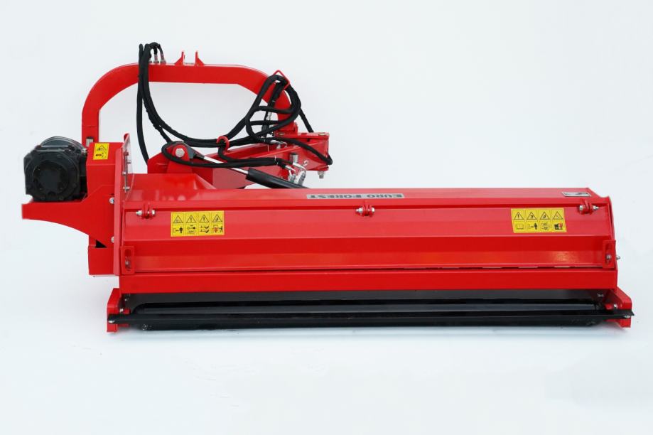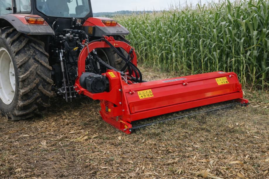 Malčer je opremljen hidrauličnim bočnim pomakom i nagibom radne glave od +90° do –65°, što omogućuje siguran i učinkovit rad na kosinama te prilagodbu različitim nagibima terena. Izvedba s čekićima (22 čekića) omogućuje pouzdano usitnjavanje visoke trave, slame, kukuruzovine te manjeg i većeg grmlja. Stražnja izbacna vrata osiguravaju bolji protok materijala i prilagodbu pri gušćoj vegetaciji.