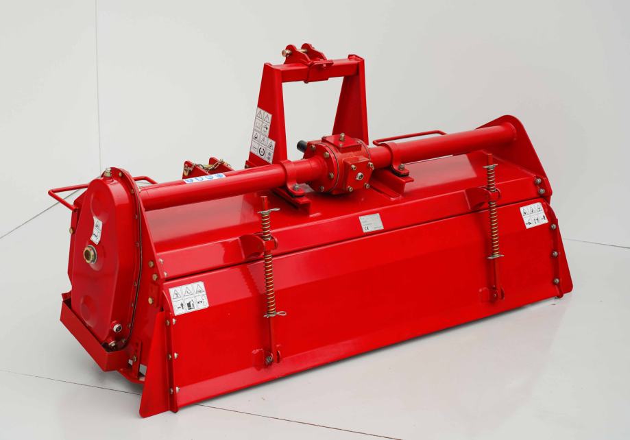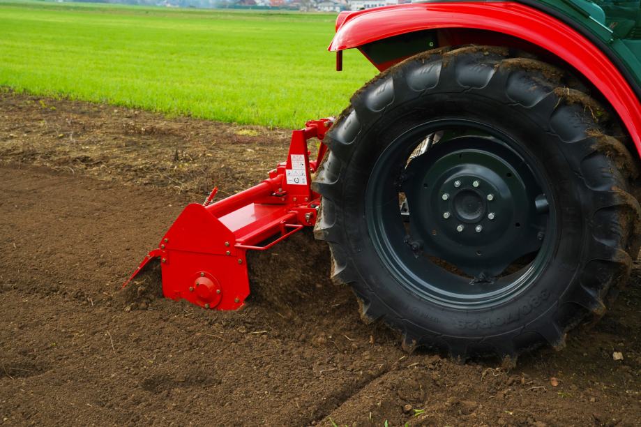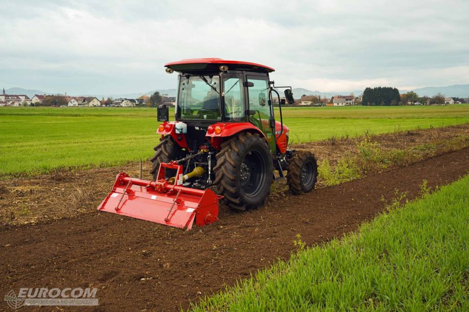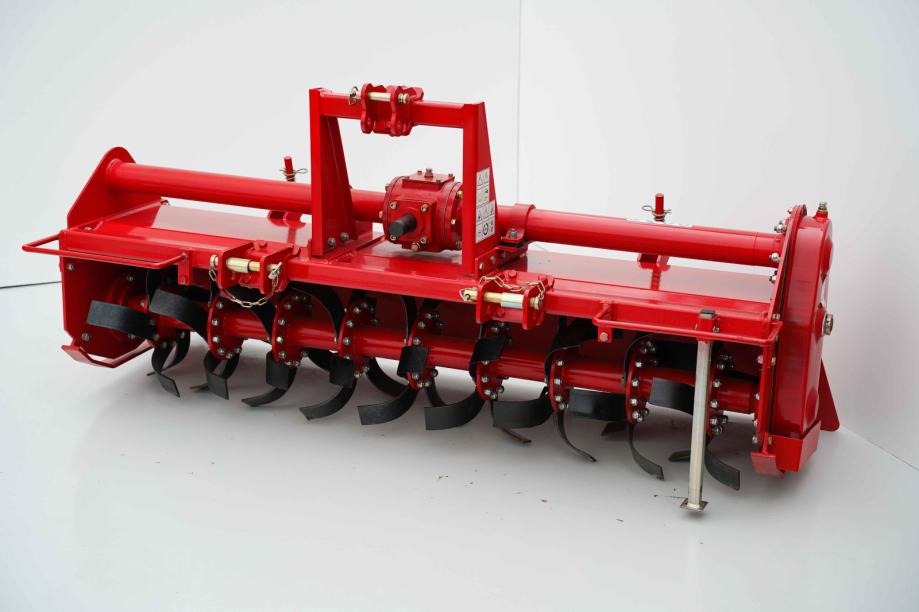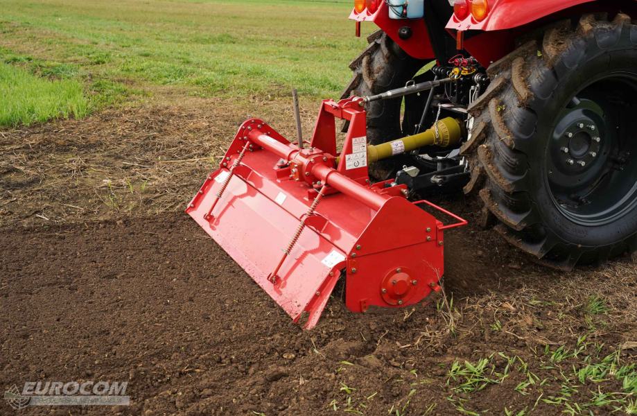 Ručni bočni pomak lijevo/desno omogućuje preciznu obradu uz ograde, stabla, rubove parcela i druge prepreke. Šest noževa po prirubnici (ukupno 54) osigurava fino usitnjavanje i homogenu strukturu tla, što omogućuje brzu i kvalitetnu pripremu sjetvene posteljice. Podesive saonice omogućuju ponovljivu dubinu obrade (približno 10–20 cm), a opružni poklopac štiti okvir pri udaru u prepreke i sprječava oštećenje stroja.