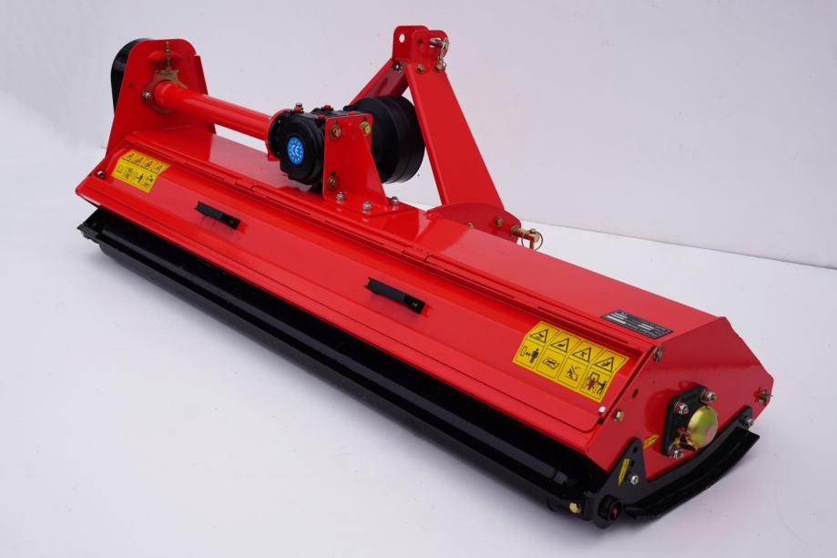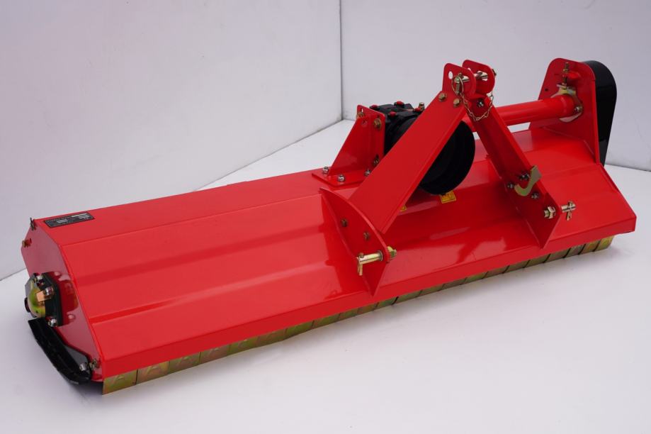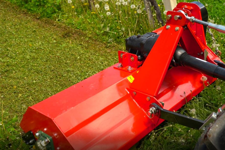 Malčer je opremljen s fiksnim pomikom, trotočkovnim priključkom in velikim reduktorjem s sklopko, ki zagotavlja zanesljivo delovanje tudi pri večjih obremenitvah. Prenos moči poteka preko treh jermenov, kar omogoča stabilno in mirno delovanje.