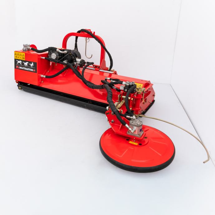 Opremljen je s 24 robusna čekića i s tri remena koji osiguravaju učinkovit i ravnomjeran prijenos snage. Hidraulično vođeni bočni disk s vlastitom hidrauličnom jedinicom omogućuje preciznu obradu uz stabla, ograde, stupove i međašne pojaseve – bez oštećenja i bez potrebe za dodatnim čišćenjem rubova. Bočni pomak i nagib u rasponu +90° / –65° osiguravaju prilagodljivost pri radu na kosinama, kanalima, povišenim terenima i drugim zahtjevnim površinama.