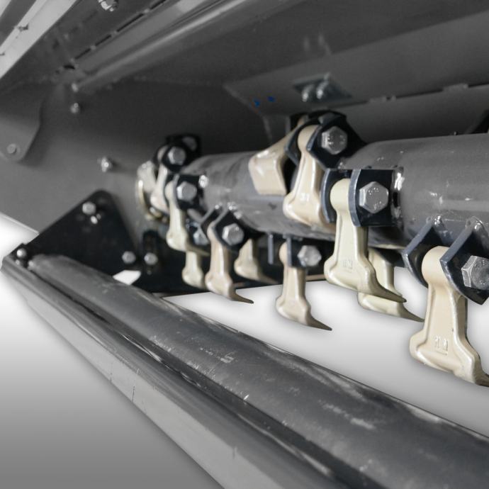 28 posebno otvrdnutih čekića, 0,8 kg, koja su raspoređena na dvostrukoj spiralnoj pogonskoj osovini, usitnjavaju isječke na minimalnu veličinu. Čak i vrlo visoka trava, grmlje ili slama nisu problem za ovu kosilicu!