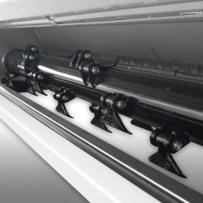 Mulčer dodatno ima valjak za vuču i slobodni prijenosnik. Visina rezanja može se postaviti pomoću gornjeg regulatora. Klizači postavljeni sa strane. Ovješene, pocinčane letvice na prednjoj strani kosilice sprječavaju kamenje.