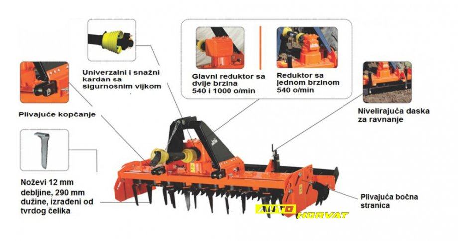 - Mjenjač u reduktoru sa dvije brzine rada kod 540 o/min kardanskog vratila -br. okretaja radnih tijela-noževa: 353 o/min kod 1000 o/min -br. okretaja radnih tijela-noževa:357 o/min