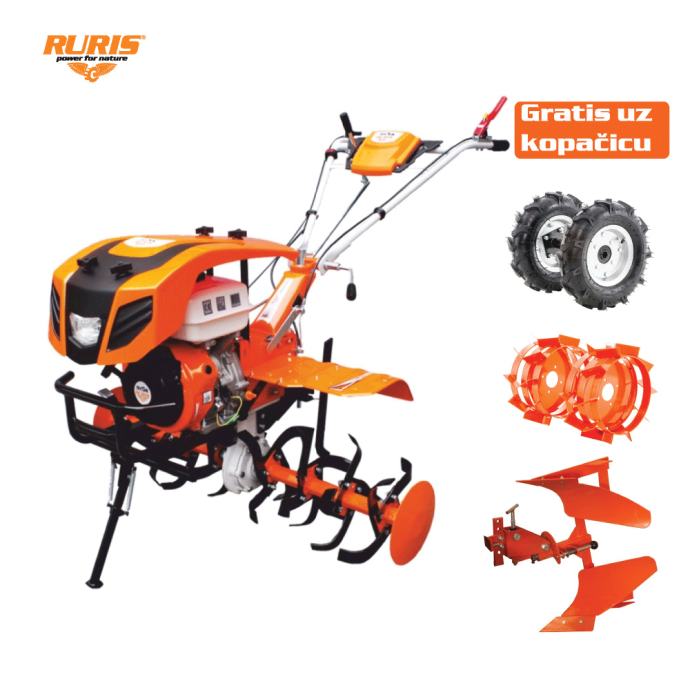 RURIS kopačica 913ACC (freza) je idealna za gospodarstva koja moraju obrađivati površine iznad 5000 četvornih metara. Opremljena s motorom od 13 KS i noževima za kopanje s podesivom širinom između 750 mm i 1100 mm, RURIS 913ACC lako može obraditi bilo koju vrstu tla bez obzira na tvrdoću, maksimalne dubine kopanja 30 cm s učinkovitosti preko 1200 m2 / h. Snažni motor i mjenjač 2 + 1 te zupčasti prijenos u uljnoj kupki čine RURIS kopačica 913ACC savršenom frezom koja je u stanju kada se na nju instaliraju transportni gumeni kotači lako vući teret od 1000 kg. Paljenje je manulano sa užetom. Pribor koji se može montirati na RURIS 913ACC su: plug, rovokopač, kultivator, tegljač-prikolica. Sve motokopačice imaju karakteristike prijenosnog sustava, vuče (pogonska osovina) na koju su pričvršćeni vijcima transportni kotači ili alati za kopanje (ovisno o njihovoj uporabi). Sve freze su prvenstveno namijenjene za kopanje uz pomoć noževa koji su pričvršćeni vijcima na jedinstvenu pogonsku osovinu. Prijenos, vuča (pogonska osovina) i sam stroj čine nerazdvojni sklop . Na ovaj stroj ne možete montirati alate kojima se može upravljati podizanjem, spuštanjem, pokretanjem ili pogonom pomoću sile snage kao u slučaju strojeva na kardansko vratilo. Na bilo koju vrstu Rurisovih i DAC motokopačica možete montirati dodatke koji rade isključivo vučom. Pakiranje uz košačicu sadrži frezu,gumene I metalne kotače te plug okretač. Sve Rurisove kopačice dolaze bez ulja u motoru I mjenjaču te vam preporučujemo korištenje isključivo originalnih ulja iz bogate palate Rurisovih proizvoda kako bi vašem stroju osigurali najbolju kvalitetu i dugovječnost motora. Svi modeli Rurisovih kopačica pakirani su u kartonsku ambalažu sa metalnim okvirom te ih je potrebno sastaviti nakon raspakiravanja. Savjetujemo da sastavljanje stroja obavite u ovlaštenom servisu ili od strane školovanih mehaničara kako bi izbjegli gubitak jamstva. U slučaju da kopačicu želite sastaviti sami pažljivo proučite upute ili pogledajte video sastavljanja na YouTube kanalu unosom modela kopačice. Snaga: 13 KS