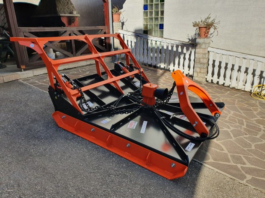 Prodajemo novoizrađene profesionalne roto malčere širine 200 cm, namijenjene za poljoprivredno-šumarsku namjenu, tj. za košnju i usitnjavanje trave, grmlja, šikara, kukuruzovine, raznih ostataka poljoprivrednih kultura. Bez problema reže drvenastu stabljiku debelu do 15 cm. Svi malčeri su naše proizvodnje (sve osim reduktora), te su kvalitetno i masivno izrađeni. Pogonsko-radni dio malčera ostvaren je preko reduktora za ekstra teške uvjete rada snage 90 kw, te vrlo masivnog čeličnog bunja na kojem su pričvršćena 4 visoko otporna lanca debljine karike 16 mm. Lanci su klase G100 vrlo velike žilavosti i otpornosti na habanje. Klasa G100 je najjaća klasa lanaca, koja se upotrebljava na strojevima za razminiranje. Svi dijelovi na malčeru (čelik, reduktor, vijci, lanci, spojnice lanaca) su novi. Reduktor je od renomiranog talijanskog proizvođača Comer industries, te je konstrukcijski namijenjen isključivo za roto malčer za vrlo teške uvjete rada, sve je dimenzionirano tako da osigurava dugotrajan i siguran način rada, brzu i jednostavnu demontažu rotora (nosača lanaca). Reduktor je omjera 1:1.50 što znači da broj okretaja na kardanu traktora multiplicira 50 %, odnosno ako npr. imate 1000 okretaja na traktoru na rotoru će biti 1500 okretaja, što u kombinaciji sa 4 visoko otporna lanca daje odlične rezultate u radu. Rotor je CNC laserskim rezanjem izrezan iz jednog komada čelika (iz jedne ploče) tako da je točnost reza i rupa ispod pola milimetra što je izuzetno bitno za balans te miran i siguran rad. Za izradu svih malčera koriste se sljedeći materijali: HARDOX čelik za skije, rotor i kompletnu školjku malčera, prihvatni ram, rogovi i ukrute školjke se izrađuju od čelika S355, vijci čvrstoće 10.9, dvokomponentna poliuretanska boja za metal. Čelična školjka malčera izrađena je od HARDOX čeličnog lima debljine 10 mm, te je ravnomjerno ojačana čeličnim rebrima 60x15 mm, tako da je vrlo kruta i ne savija se tijekom rada. Hardox čelik je čelik otporan na trošenje dok je istovremeno vrlo žilav i kao takav se koristi za izradu strojeva za razminiranje, bagerske korpe i slično. Debljina lima od 10 mm osigurava neprobojnost prilikom rada ili kod eventualnog pucanja lanca. Malčeri na bočnim stranama imaju po cijeloj dužini klizne regulirajuće skije koje osiguravaju uvijek pravilno praćenje neravnina terena kao i to da je malčer uvijek čvrsto sljubljen s tlom pa malč, kamenje i ostalo prilikom rada ne mogu izletiti na bočne strane, što daje dodatnu sigurnost stroja. Sa regulirajućim skijama moguće je podesiti visinu košnje. Na stražnjoj strani nalazi se dvodijelna ralica koja služi za guranje, odnosno stiskanje-prevrtanje visokog grmlja, šikara i drveća. Ralica se sastoji od dva dijela, donje niske i gornje visoke ralice koja nije nužna za kupnju. Na malčeru je napravljena stražnja hidraulična zaklopka koja omogućava zatvaranje kada se radi unaprijed radi boljeg usitnjavanja i zaštite od izbacivanja, a otvara se kada se radi unatrag. Hidraulični celindri koji otvaraju rampu su izuzetno snažni (iste upotrebljavamo na prednjim traktorskim hidraulikama nosivosti 2 tone. Ovaj stroj karakterizira savršen rad u oba smjera, rad unaprijed preko površina preko kojih je moguće prolaziti traktorom bez oštećenja, te rad unatrag preko površina koje mogu uzrokovati oštećenja ukoliko bi se išlo direktno preko njih. Moguće je i kopčanje na prednju hidrauliku što daje dodatnu učinkovitost ovakvom tipu stroja. Kod rada u velikim šikarama i drobljenu debljeg drveća potrebna je mala brzina rada (pužne brzine).