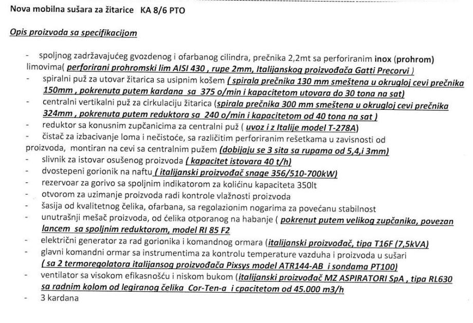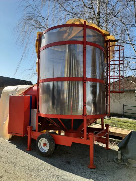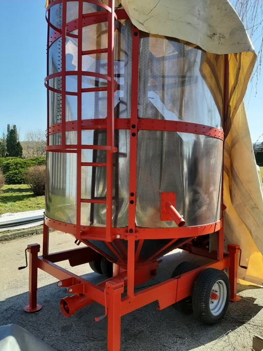 Mobilna sušara za žitarice KREATEK AGRO model KA 8/6 PTO sa kardanskim pogonom preko traktora, kapaciteta 8 m3, sa gorionikom na dizel, pužem za punjenje, slivnikom za istovar robe, agregatom za struju, komandnim ormarom, čistačem za lom, perforiranim limom sa rupama prečnika 2 mm