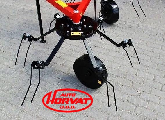 - Stroj radi preko kardanskog pogona traktora, ima dva rotora od kojih svaki rotor ima 5 ruku sa oprugama.