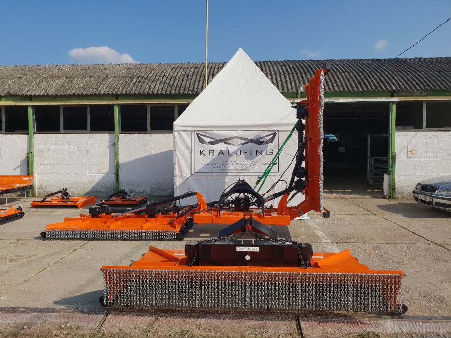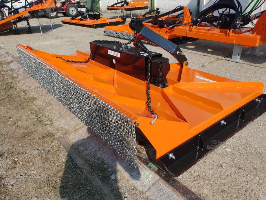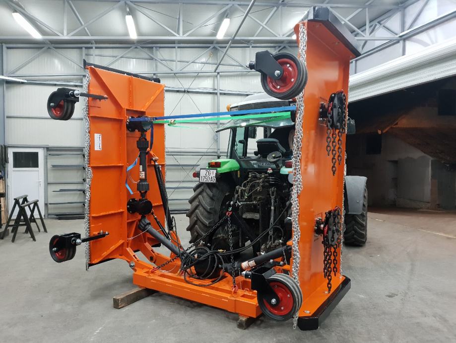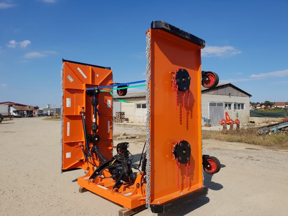 Prodajemo novoizrađene profesionalne roto malčere radne širine 600 cm, namijenjene za poljoprivrednu namjenu, tj. za košnju i usitnjavanje trave, sitnijeg grmlja, kukuruzovine, raznih ostataka poljoprivrednih kultura. Bez problema reže drvenastu stabljiku debelu do 3 cm. Svi malčeri su naše proizvodnje (sve osim reduktora), te su kvalitetno i masivno izrađeni. Malčer je koncipiran kao dvodijelni (prednji + stražnji). Prednji malčer je ukupnog gabarita 3 metra a radne širine 270 cm. Pogonsko-radni dio prednjeg malčera ostvaren je preko 3 reduktora, srednjeg "T" reduktora snage 40.4 kw i 2 radna reduktora za teške uvjete rada, snage 44 kw, te vrlo masivnih čeličnih rotora na kojima je pričvršćeno 6 visoko otpornih lanaca debljine karike 7-10 mm. Pogonsko-radni dio stražnjeg malčera ostvaren je preko 5 reduktora, srednjeg "T" reduktora snage 110 kw i 4 radna reduktora za teške uvjete rada, snage 44 kw, te vrlo masivnih čeličnih rotora na kojima je pričvršćeno 12 visoko otpornih lanaca debljine karike 7-10 mm. Reduktori su međusobno povezani kardanima. Lanci su klase G80 (3-5 tona nosivosti), vrlo velike žilavosti i otpornosti na habanje. Svi dijelovi na malčeru (čelik, reduktor, vijci, lanci, spojnice lanaca) su novi. Reduktori su od renomiranog talijanskog proizvođača Comer industries, te su konstrukcijski namijenjeni isključivo za roto malčer, sve je dimenzionirano tako da osigurava dugotrajan i siguran način rada, brzu i jednostavnu demontažu rotora (nosača lanaca). Radni reduktori su omjera 1:1.5 što znači da broj okretaja na kardanu traktora multiplicira 50 %, odnosno sa 1000 okretaja na traktoru na rotoru čće biti 1500 okretaja, što u kombinaciji sa po 3 visoko otporna lanaca daje odlične rezultate u radu. Rotor je CNC laserskim rezanjem izrezan iz jednog komada čelika (iz jedne ploče) tako da je točnost reza i rupa ispod pola milimetra što je izuzetno bitno za balans te miran i siguran rad. Za izradu svih malčera koriste se sljedeći materijali: konstrukcijski čelik S420, vijci čvrstoće 8.8, dvokomponentna poliuretanska boja za metal. Čelična školjka malčera izrađena je od toplo valjanog čeličnog lima debljine 10 mm, te je ravnomjerno ojačana čeličnim rebrima 80x12 mm, tako da je vrlo kruta i ne savija se tijekom rada. Debljina lima od 10 mm osigurava neprobojnost prilikom rada ili kod eventualnog pucanja lanca. Malčeri na bočnim stranama imaju po cijeloj dužini klizne regulirajuće skije koje osiguravaju uvjek pravilno praćenje neravnina terena kao i to da je malčer uvijek čvrsto sljubljen s tlom pa malč, kamenje i ostalo prilikom rada ne mogu izletiti na bočne strane, što daje dodatnu sigurnost stroja. Sa regulirajućim skijama moguće je podesiti visinu košnje kao i nagib stroja-prednji dio viši radi manjeg otpora kod ulaza trave a stražnji dio niži radi bolje košnje). Malčer zbog velike širine ima i valjke po cijelog dužini. Umjesto valjaka mogu se staviti kotači od pune gume, ravnog gaza (profilacije) sa okretnim vilicama velike nosivosti. Kotači imaju ugrađen čistače tako da se nelijepi blato i ne diže stroj u zrak. Kopčanje malčera moguće je na traktore 2. kategorije – ugrađeni su kaljeni klinovi 28 mm.