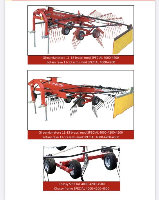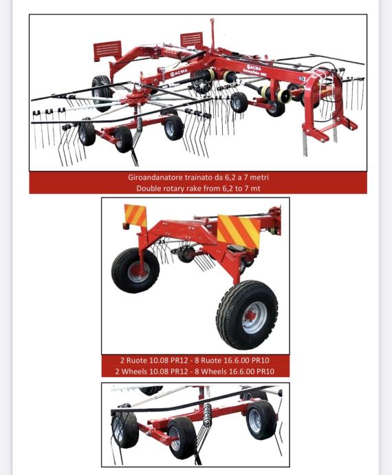 Prodajemo sakupljače sijena,prigrtač,švader,prevrtace sijena,roto kose sa 4-5-6-7-8 diskova,duplex i bubnjaste kose poznatog talijanskog proizvođača Acma.Na stanju imamo više različitih modela.Za detalnije info molimo da nazovete