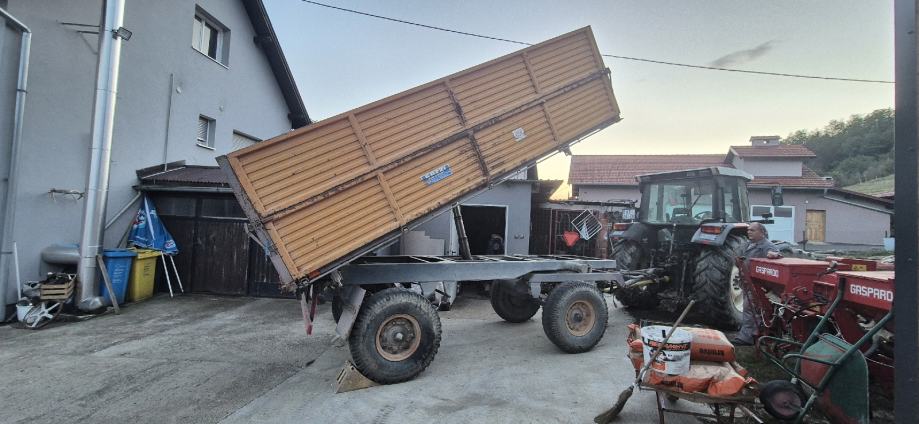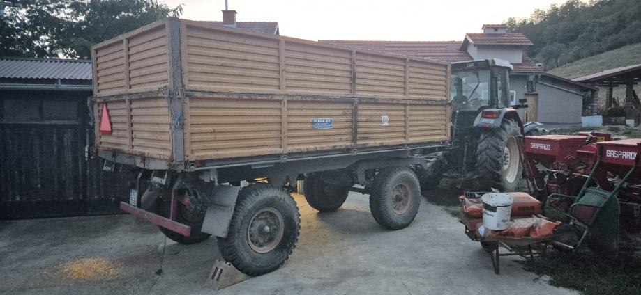 Traktorska prikolica 8t, stane 8.5t kukuruza, zračne i hidraulične kočnice, trostrani kiper ima svoju pumpu i kardan, rinfuzno otvaranje stranica, automatsko otvaranje zadnje stranice kod kipanja. Registracija do 8.2025.