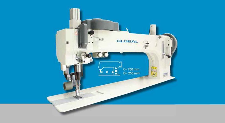 Specijalni cik-cak stroj za šivanje jedra (extra heavy duty), produžena radna površina 760x250mm (longarm), promjena vrsta šava putem ekscentra (2, 3 i 4 uboda u cik caku). Veliki (barrel-shuttle) petljać za debeli komac, povratni bod. Standardno se isporučuje s dodatnim transportom - puller, pneumatsko automatsko podizanje stopice i pneumatski povratni bod.