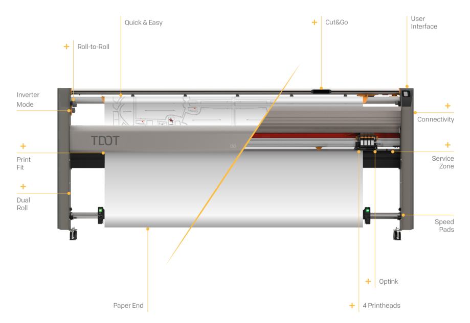 TKT TDOT koristi najmoderniju tehnologiju koja omogućava krajnjem korisniku lako korištenje, te visoku pouzdanost. Određene komponente na stroju povezane su WiFi vezom sa upravljačkom jedinicom stroja i na taj način dojavljuju istrošenost dijelova koje je potrebno zamijeniti. Kočnica za papir dolazi u 3 nivoa prema gramaži papira koji se koristi. Ploter posjeduje vlastiti softver za ispis krojnih slika putem kojeg je moguće birati način ispisa i kvalitetu ispisa u 4 nivoa.