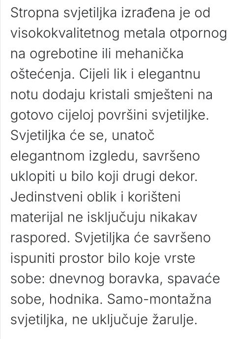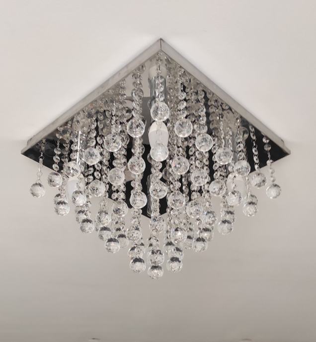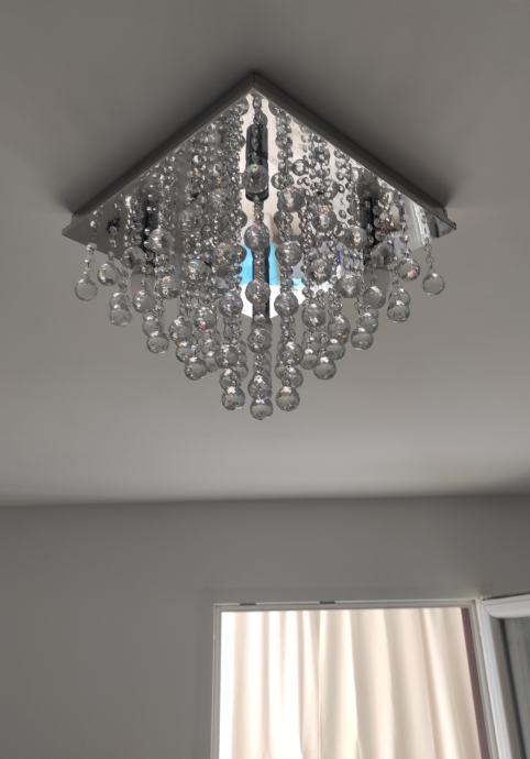 Prodajem kristalni luster pravokutnog oblika, dimenzije 40x40, prekrasan ali nažalost ne odgovara prostoriji za koju je kupljen tj. malen za namijenjenu prostoriju. Luster je montiran na strop i odmontiran isti dan tako da nije korišten. Žarulje koje mu odgovaraju su E14 - 4 komada. Više opisa na jednoj od slika. Zadnje dvije slike su stvarne tj. fotografirano nakon postavljanja na strop. Plaćen 95 eura (tvrtka Toolight).