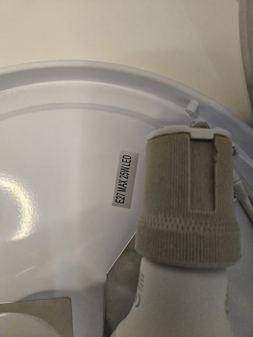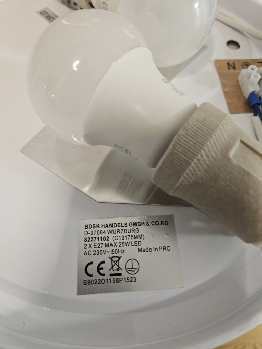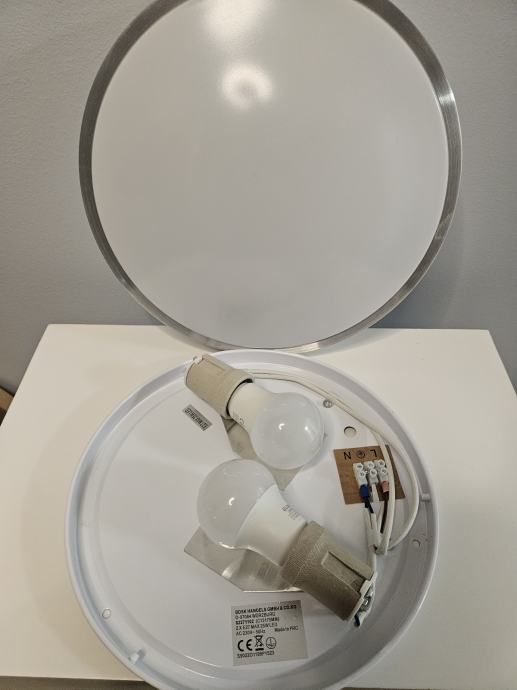 Prodajem stropnu plafonjeru promjera 30 cm s bijelim difuzorom i aluminijskim rubom srebrne boje. Plafonjera ima dva grla E27 s maksimalnom snagom 25W LED svake, napajanje AC 230V / 50Hz. Dolazi s dvije LED žarulje.