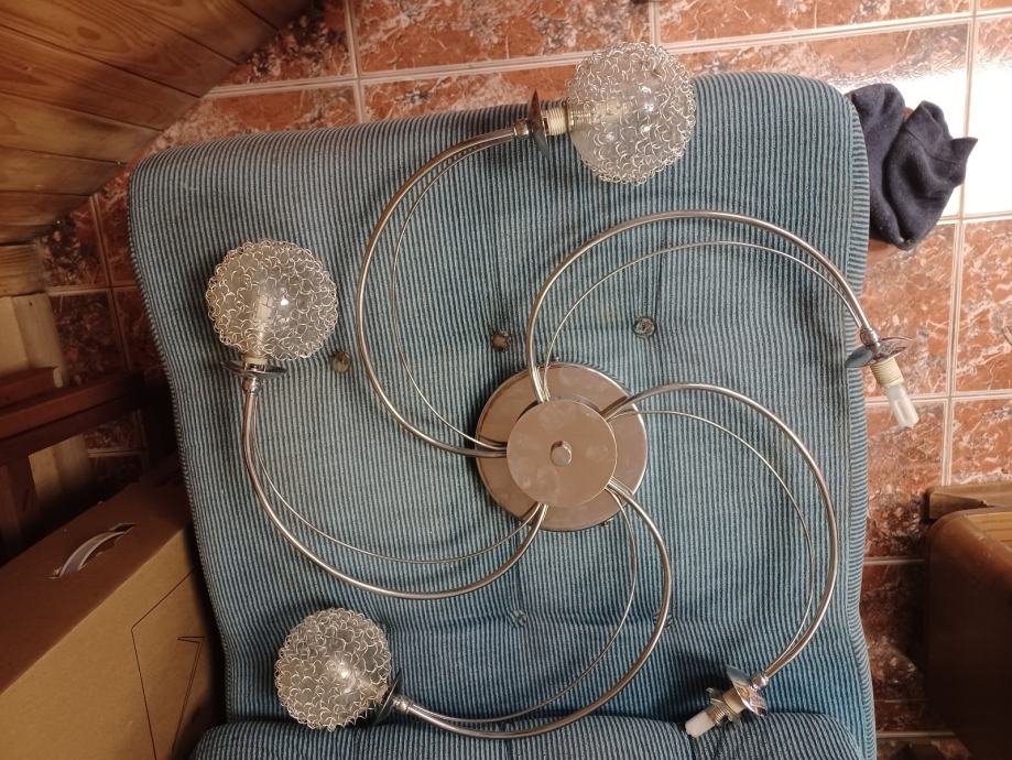 Dva ista rasvjetna tijela stropna sa žaruljama. Na jednom rasvjetnom tijelu nedostaju 2 kugle. Promjer 65cm. Veličina kugle 10 cm. Cijena za oba 40eura.