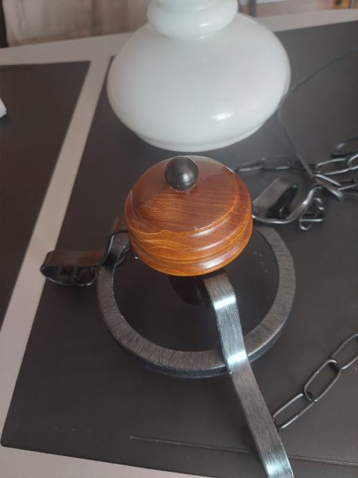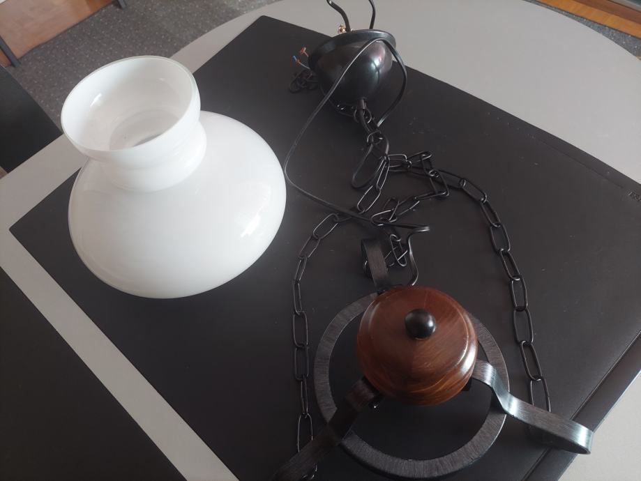 Viseći drveno-metalni luster sa bijelim staklenim sjenilom