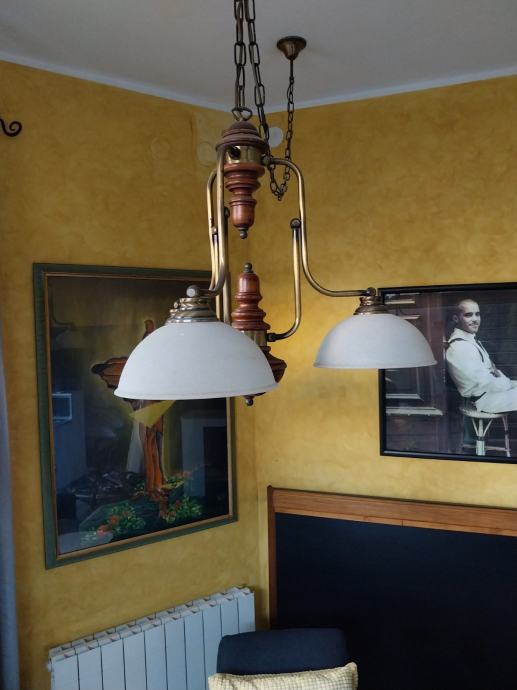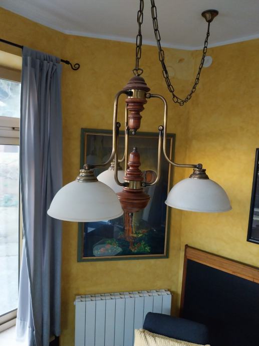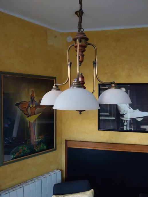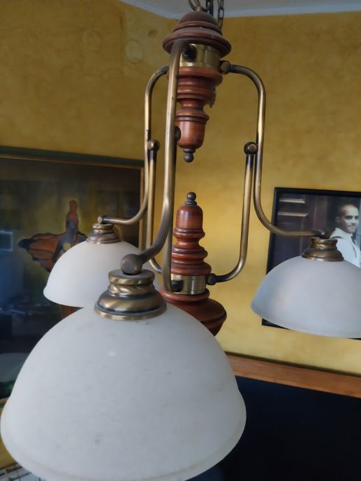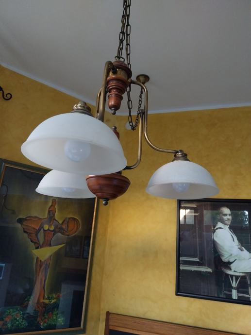 Luster u vintage stilu sa staklenim kuglama,metal u brončanoj staroj boji,nema oštećenja i sve žarulje rade,skupa sa žaruljama.