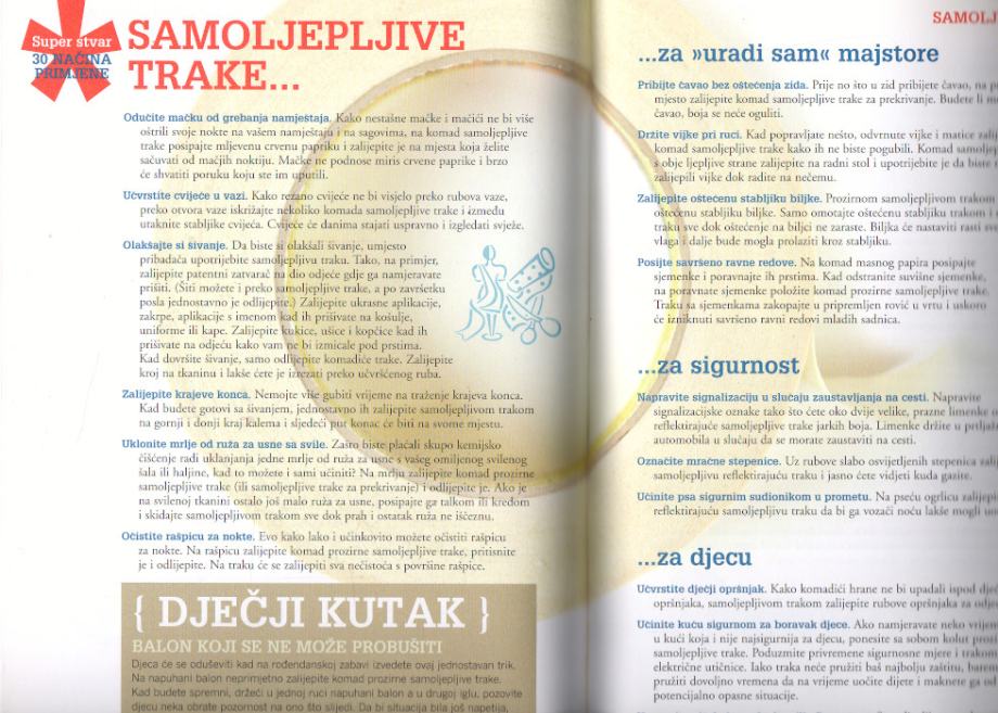 Savjeti koji se nalaze u ovom priručniku kreću se od oživljavanja akumulatora jednim aspirinom, preko izrade boje za slikanje prstima od jogurta, do obnavljanja namještaja od pletnog šiblja pomoću kuhinjske soli. U više od 2000 natuknica nude se savjeti za novu i neuobičajenu upotrebu poznatih predmeta i sastojaka koje najčešće nalazimo na policama domaćinstava.