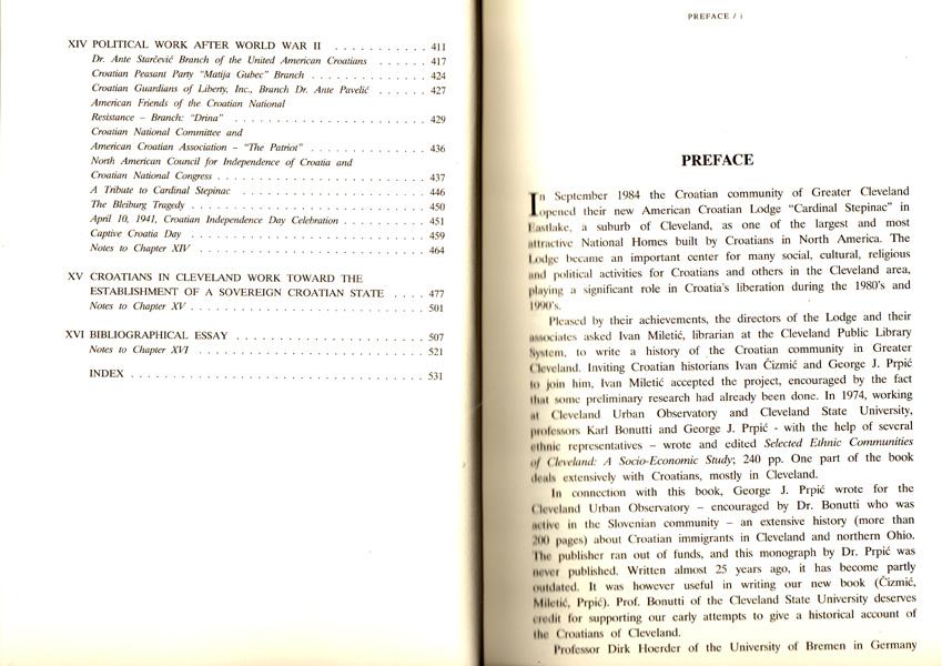 Knjiga prati povijest djelovanja Hrvatske zajednice u Clevelandu od dolaska prvih hrvatskih iseljenika potkraj 19. st. pa sve do današnjih dana. Historijat ove Zajednice autori su podijelili u dva poglavlja: prvo obuhvaća razdoblje od 1880. do 1945., a drugo zaokružuje doba nakon Drugog svjetskog rata pa sve do današnjih dana. Unutar spomenutih vremenskih okvira autori govore o udjelu hrvatskih iseljenika u nekim američkim povijesnim događajima, njihovu kulturnom životu u novoj domovini, običajima, religiji, gospodarskim dostignućima, sportskim uspjesima te političkim aktivnostima nakon Drugog svjetskog rata i doprinosima u stvaranju neovisne Hrvatske.