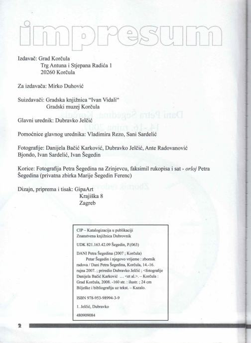 Dani Petra Šegedina, Korčula, 14.-16. rujna 2007. Zbornik radova (Z118