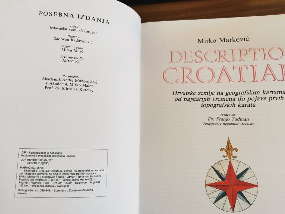 Mirko Marković: Descriptio Croatiae; Hrvatske zemlje na geografskim kartama od najstarijih vremena do pojave prvih topografskih karata, Naprijed, Zagreb 1993. Detaljna i sveobuhvatna povijest kartografije hrvatskih zemalja kroz vijekove. Iscrpna bibliografija, kazalo osobnih imena i kazalo geografskih imena (toponima). Knjiga je opremljena mnogobrojnim ilustracijama i na sjajnom papiru. Jedno od kapitalnih djela naše znanosti, sumjerljivo sa sličnim europskim djelima (Descriptio Istriae, Descriptio Austriae, Descriptio Hungariae). Dimenzije 26x32 cm, tvrdi platneni uvez s ovitkom, sjajan papir, savršeno stanje, 371 str.