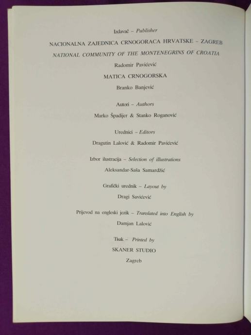 Nakladnik: Nacionalna zajednica Crnogoraca Hrvatske – Zagreb, Matica crnogorska - Cetinje