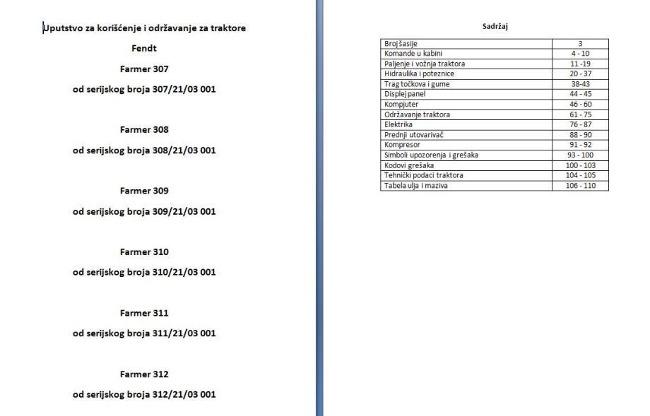 Upute za uporabu i održavanje na hrvatskom/srpskom za traktore Fendt Farmer 307--308-309-310-311-312. (1993-2000 godište).