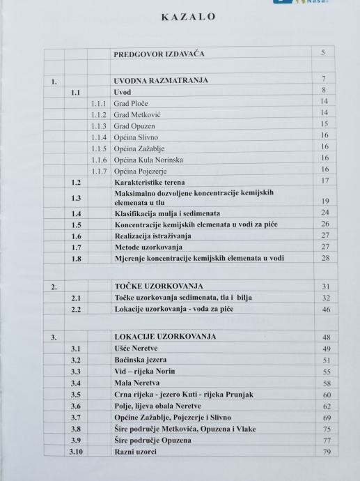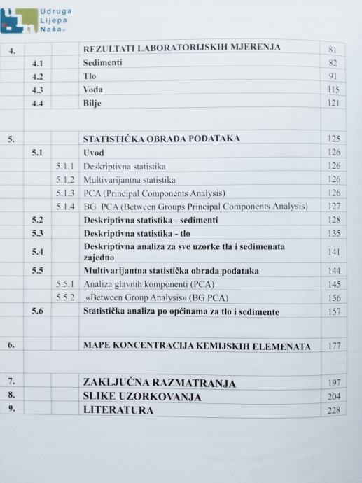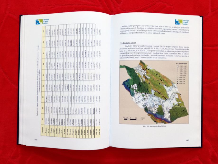 sedimenti, voda za piće i vegetacija prikazani su u ovoj knjizi. U više od 500 uzoraka tla i sedimenta analizirane su koncentracije kalija (K), kalcija (Ca), titana (Ti), vanadija (V), kroma (Cr), mangana (Mn), željeza (Fe), nikla (Ni), bakra (Cu), cinka (Zn), galija (Ga), arsena (As), broma (Br), rubidija (Rb), stroncija (Sr), itrija (Y), cirkonija (Zr) i olova (Pb). Prikupljeno je više od 100 uzoraka vode za piće iz