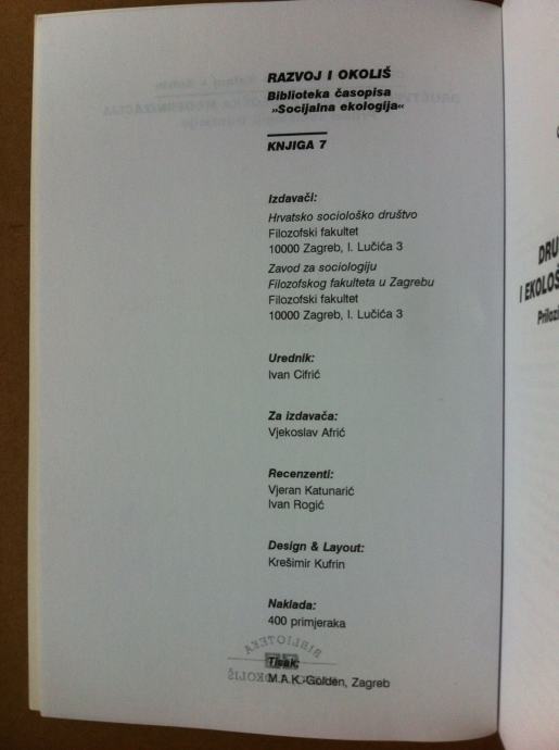 Razvoj i okoliš, Biblioteka časopisa „Socijalna ekologija“, knjiga 7