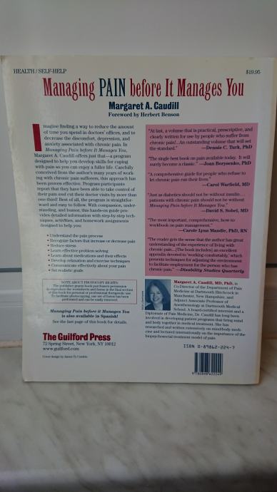 Imagine finding a way to spend less time in doctors’ offices, and to decrease the discomfort, depression, and anxiety associated with chronic pain. Managing Pain Before It Manages You offers just that--a program to help you reduce your pain and learn coping skills to get your life back. Developed over the author’s many years of working with chronic pain sufferers, this program has been proven effective. Program participants report that they have been able to take control of their pain andcut their doctor visits by more than one third! Straightforward and compassionate, this hands-on guide provides detailed information plus step-by-step techniques, activities, and worksheets (perforated for easy removal and photocopying). Dr. Margaret Caudill helps you: