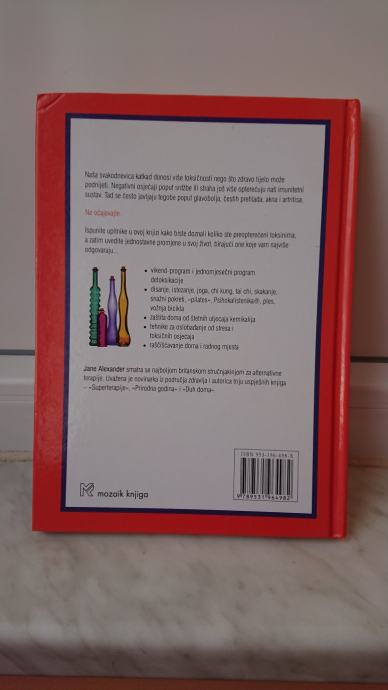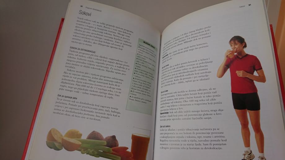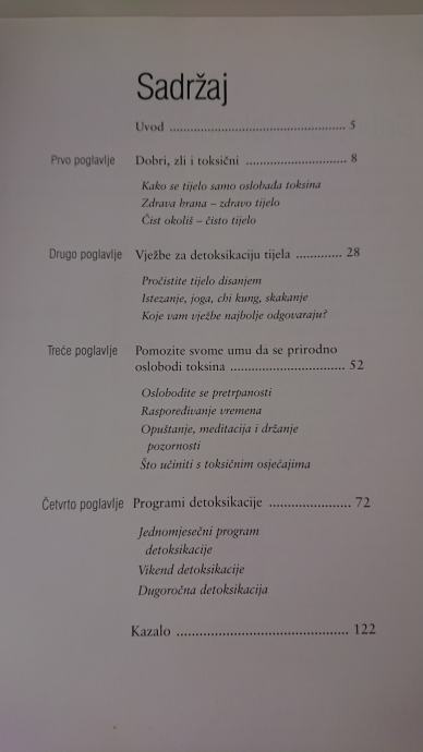 U ovoj knjizi pronalaze se i predlažu načini poticanja mehanizama detoksikacije tijela. Uvodni dio govori o prirodnom tjelesnom sustavu detoksikacije, kako bi se stekla jasna slika o tome kako tijelo prerađuje i izbacuje toksine.Slijedi poglavlje u kojem su predložene vježbe za detoksikaciju: istezanje, joga, chi kung ili skakanje. Sljedeće poglavlje se bavi uređenjem doma, oslobađanjem pretrpanosti u domu, na radnom mjestu i u samom umu. Potrebno je, po autorici, srediti misli i osjećaje, uspostaviti red u svom životu i time potaknuti skladan protok vitalne energije.U tome su meditacija i opuštanje moćni saveznici. Zadnje poglavlje donosi kompletne prijedloge programa za detoksikaciju po danima i tjednima.Predlažu se tri vrste programa: jednomjesečni, petodnevni ili vikend program, ovisno o mogućnostima i potrebama. U provođenju programa ističe prednosti hidroterapije i aromaterapije, kroz kupelji, udisanje pare i masaže.