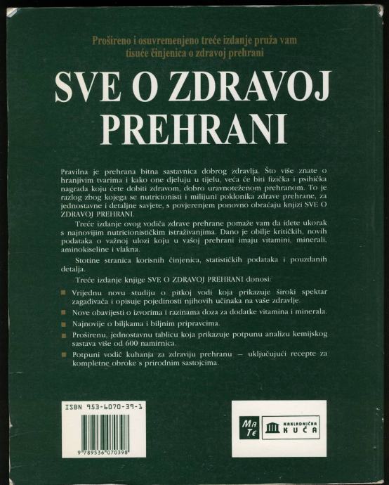 Uz ovu knjigu naučit ćete da je uravnotežena prehrana osnovica zdravog načina života. Proučava jednostavne i detaljne savjete koje su ujedinili poznati nutricionisti. Zdrava prehrana je neophodna za normalan rast i razvitak ljudskog organizma, za normalnu reprodukc? u, za optimalnu razinu aktivnosti i radne učinkovitosti, za otpornost na infekc?e i bolesti. Što više znate o hranjivim tvarima i kako one djeluju u t?elu, veća će biti psihička i fizička nagrada koju ćete dobiti zdravom, uravnoteženom prehranom. To je razlog zbog kojeg se nutricionisti i mil? uni poklonika zdrave prehrane za jednostavne i detaljne savjete s povjerenjem ponovno obraćaju knjizi Sve o zdravoj prehrani.