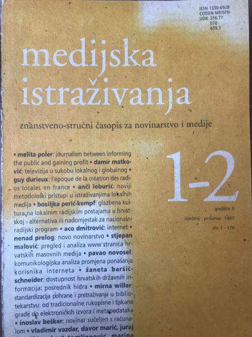 Medijska istraživanja / iz 1997. / 170 str / 32,08 kn / Pula