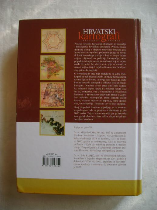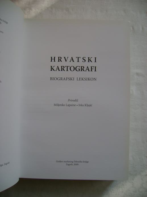 Miljenko Lapaine / Ivka Kljajić - Hrvatski kartografi; biografski leksikon - izdavač Golden marketing - Tehnička knjiga, Zagreb 2009. godine, 18 x 25 cm, tvrdi uvez, 694 stranice, ilustrirano, tiskano na kvalitetnom papiru.