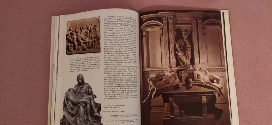Slikarstvo ,kiparstvo ,arhitektura, primijenjena umjetnosti.Kvalitetan papir, slike prelijepih djela ljudske kreativnosti.