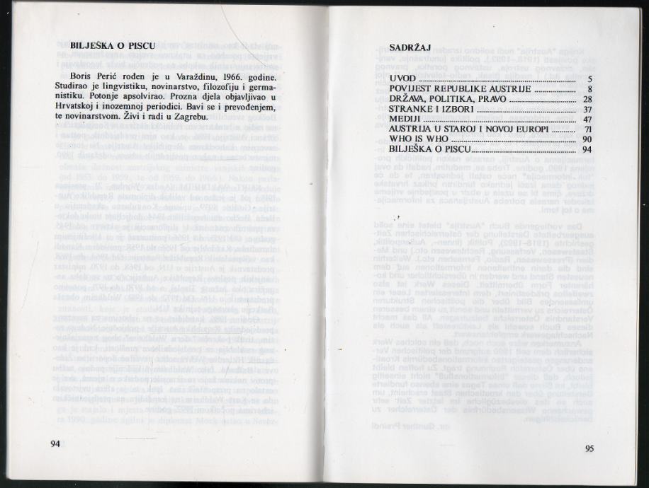 Knjiga nudi cjelovito izrađen prikaz austrijske povijesti od sloma Monarhije 1918. do 1992., unutrašnje i vanjske politike, društvenog ustroja i pravnog poretka. Posebno poglavlje posvećeno je masovnim medijima - tisku, radiju i televiziji. Na kraju knjige navedeni su kratki biografski podaci najznačajnijih austrijskih političara.