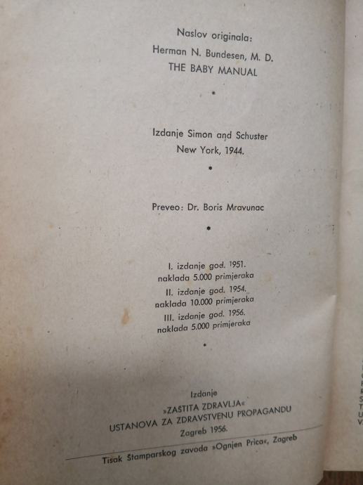 Herman N. Bundesen: Prve dvije godine, izdanje Simon and Schuster, New York 1944., preveo dr. Boris Mravunac, III. izdanje, izdavač "Zaštita zdravlja" - Ustanova za zdravstvenu propagandu, Zagreb, 1956., cijena 5 eura.
