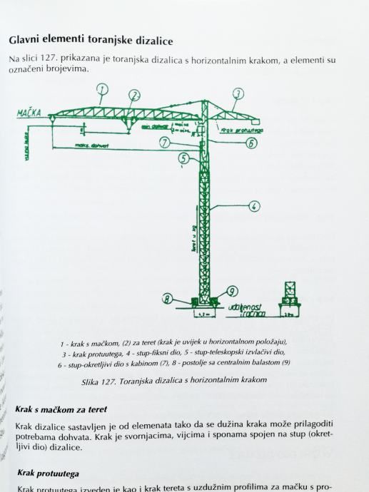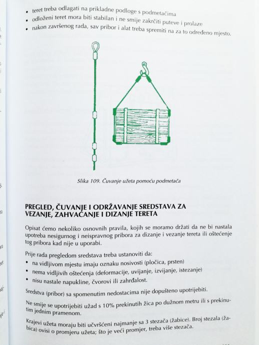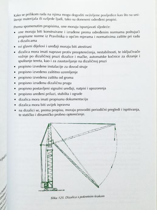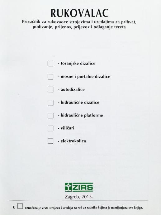 Priručnik za rukovaoce strojevima i uređajima za prihvat, podizanje, prijenos, prijevoz i odlaganje tereta.Knjiga sadrži uvod u zaštitu pri radu; osnove mehanike i hidraulike; održavanje sredstava rada; sredstva za prijenos tereta; signalizaciju; palete i kontejnere. Toranjske, mosne i portalne dizalice; autodizalice; hidrauličke dizalice i platforme; viličare; elektrokolica.