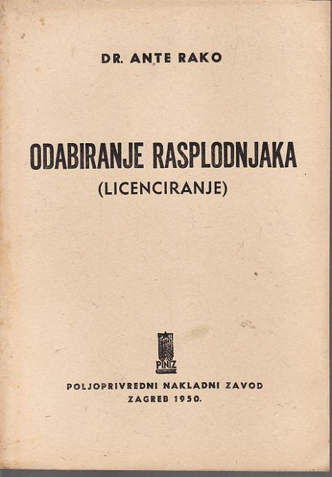 8. ANTE RAKO : ODABIRANJE RASPLODNJAKA (LICENCIRANJE) , MEKI UVEZ , 24 CM , ZAGREB 1930. 114 STR. ILUSTR.........50 KUNA