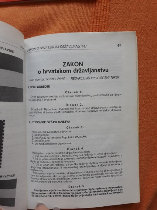 Sadržaj s nasl. str.: Ustav Republike Hrvatske (pročišćeni tekst) ; Ustavni zakon za provedbu Ustava Republike Hrvatske ; Zakon o grbu, zastavi i himni Republike Hrvatske te zastavi i lenti predsjednika RH ; Zakon o hrvatskom državljanstvu (redakcijski pročišćen tekst) ; Zakon o izborima zastupnika u Hrvatski sabor ; Temeljne odrednice Ustava ; Abecedno pojmovno kazalo