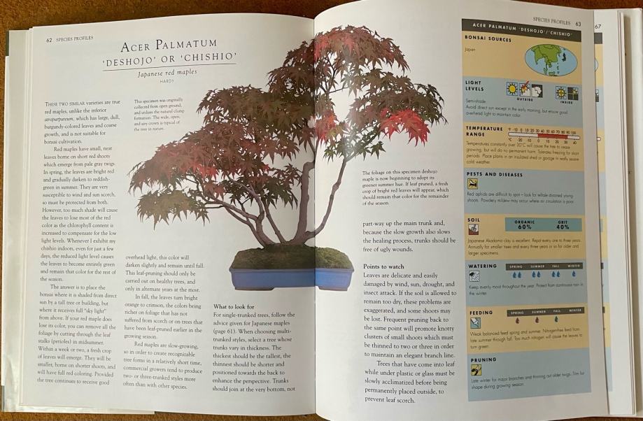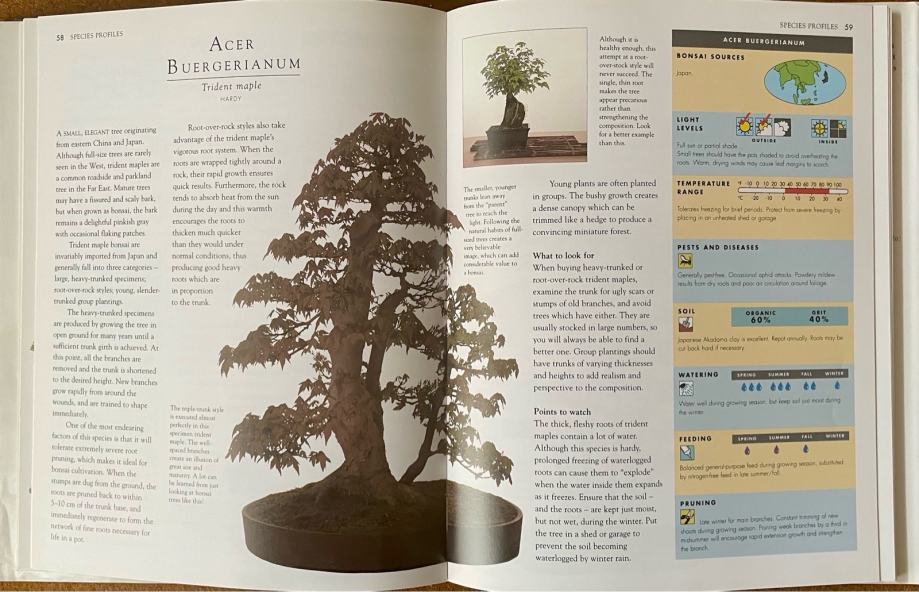 The Species Profiles present a tree-by-tree guide to 50 popularly grown, easily available varieties ranging from different kinds of maple (Acer), with their colourful foliage, to exotic flowering species such as pomegranate (Punica granatum). Care charts give clear guidance on sources, light levels, temperature range, pests and deseases, soil, watering, feeding and pruning. Easy-to-use symbols allow quick access to information and comparison between different species.
