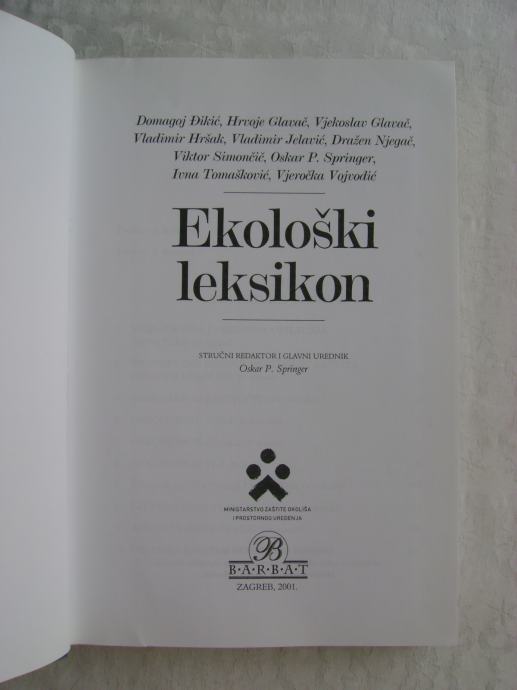 Grupa autora - Ekološki leksikon - glavni urednik Oskar P. Springer, izdavači Barbat i Ministarstvo zaštite okoliša i prostornog uređenja RH, Zagreb 2001. godine, 16 x 24 cm, tvrdi uvez, 361 stranica.