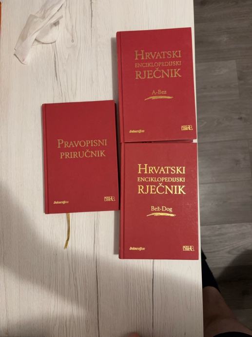 enciklopedijskog rječnika (HER) u izdanju Jutarnjeg lista – svezak A-Bez i svezak Bež-Dog – zajedno s Pravopisnim priručnikom istog izdavača. Sva tri sveska su u tvrdim crvenim koricama s pozlaćenim natpisima, karakterističnim za to izdanje.