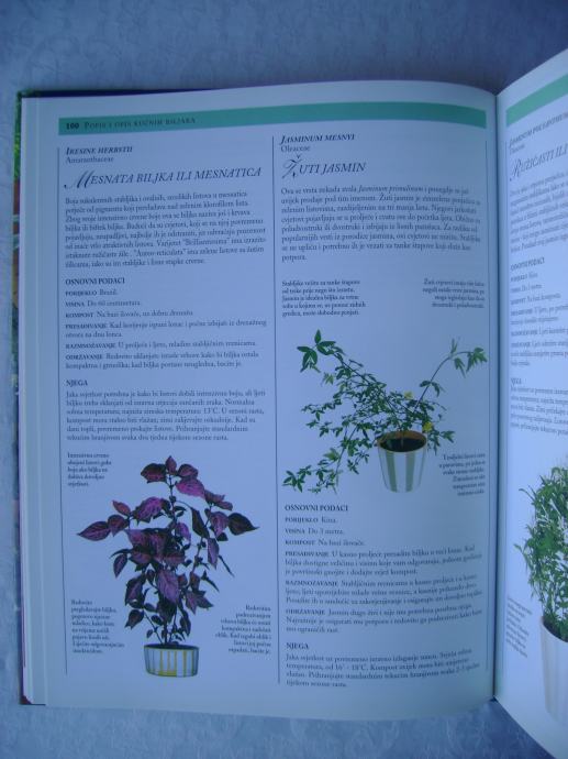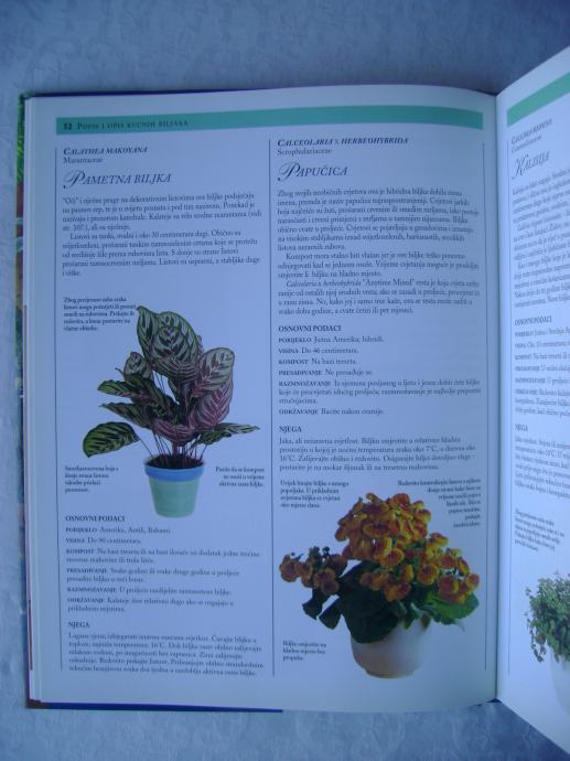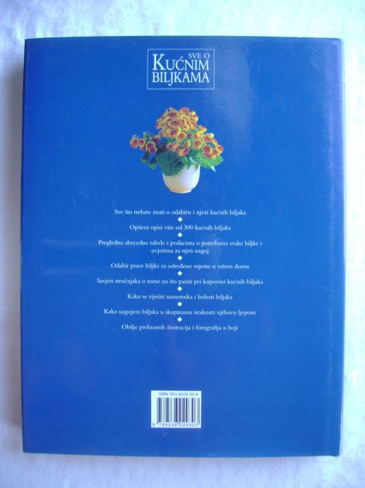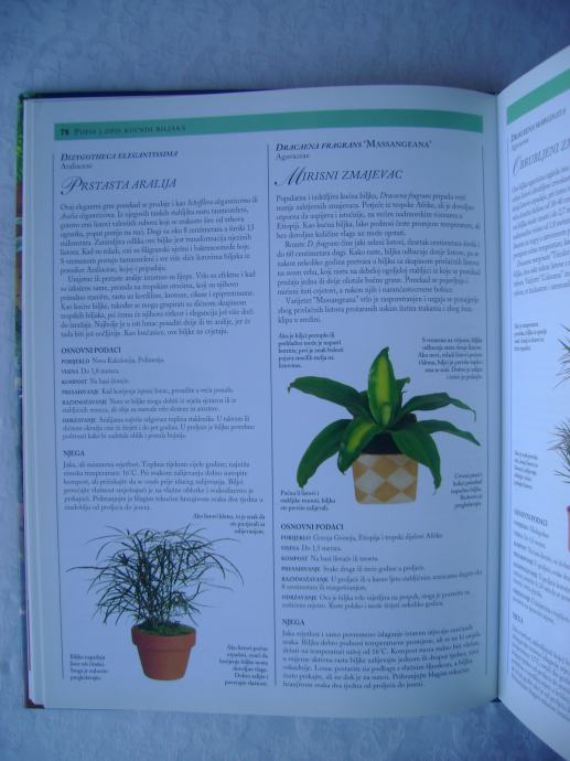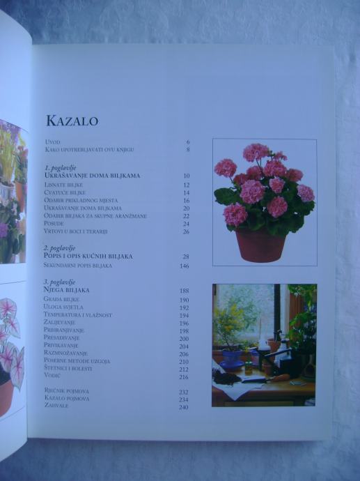 "Ova knjiga sadrži sve što želite znati o kućnim biljkama: kako ih odabrati, kako se za njih brinuti, na koje ih mjesto postaviti... Okosnicu ove knjige čine dvije skupine biljaka, poredane abecednim redom i ilustrirane fotografijama u boji. U glavnoj je skupini detaljno opisano više od 170 najčešćih i najpopularnijih vrsta biljaka, njihova veličina, boja, količina svjetlosti i vlage koja im je potrebna, temperatura pri kojoj najbolje uspijevaju, kako se sade, presađuju, razmnožavaju, te kakvu brigu zahtijevaju. U drugoj je skupini prikazano više od 130 rijeđih biljaka koje uzgajane u zatvorenom prostoru mogu stvoriti poseban ugođaj."