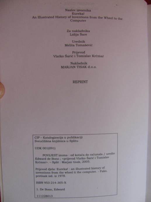 Knjiga Povijest izuma OD KOTAČA DO RAČUNALA. Edward de Bono. 2005 g. S