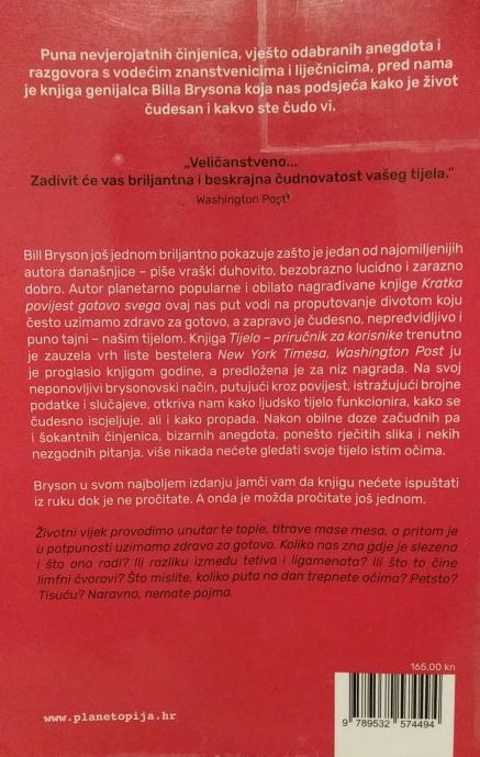 Bill Bryson još jednom briljantno pokazuje zašto je jedan od najomiljenijih autora današnjice – piše vraški duhovito, bezobrazno lucidno i zarazno dobro. Autor planetarno popularne i obilato nagrađivane knjige Kratka povijest gotovo svega ovaj nas put vodi na proputovanje divotom koju često uzimamo zdravo za gotovo, a zapravo je čudesno, nepredvidljivo i puno tajni – našim tijelom.